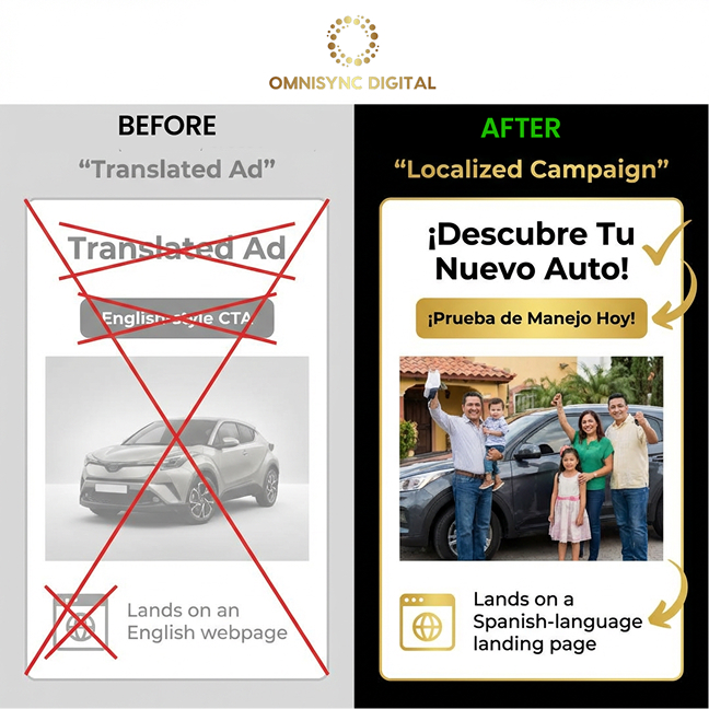 Translation is running your English ad copy through a language tool and hoping it sounds right. Localization is building campaigns from the ground up for the Spanish-speaking audience — with messaging, offers, creative, and tone that are culturally accurate and resonate naturally.